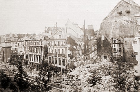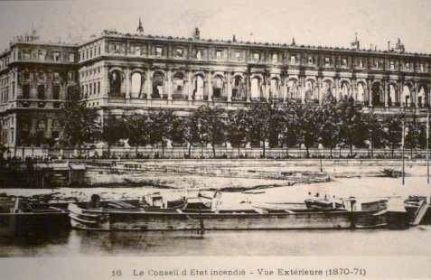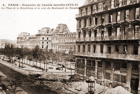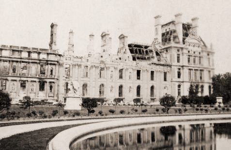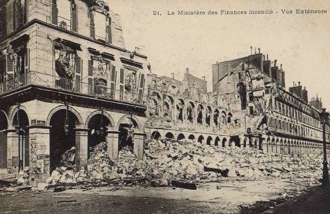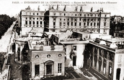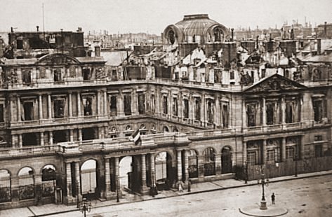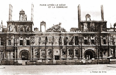 La Commune de Paris, période insurrectionnelle de l’histoire de Paris, dura un peu plus de deux mois, du 18 mars 1871 à la « Semaine sanglante » du 21 au 28 mai 1871. Les communards ont brûlé l'Hôtel de Ville (y compris toutes les archives de la ville), le Palais des Tuileries, le Palais de Justice, la Préfecture de Police, le Ministère des Finances, la Cour des Comptes, le bâtiment du Conseil d'Etat, le Palais-Royal, une partie du Palais du Louvre etc..