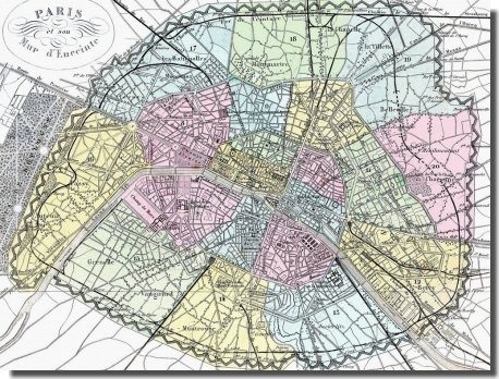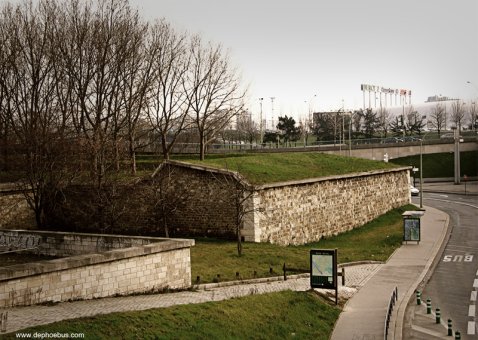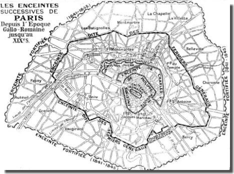 L'enceinte de Thiers, d'une longueur de 34 km, a été construite de 1841 à 1844. Le mur d’enceinte haut de 10 mètres surplombait un large fossé. Il comportait 94 bastions, 62 portes ou poterne, ainsi que de passages de chemin de fer et de rivières ou canaux.