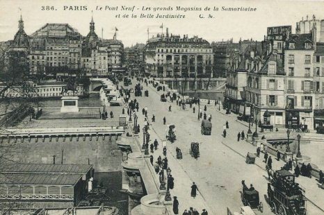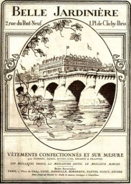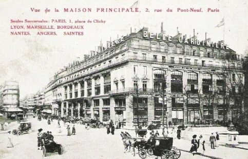 Le premier magasin de la Belle Jardinière a été crée en 1824 sur l'île de la Cité, c’est le premier grand magasin parisien regroupant en un même lieu des espaces de vente et des ateliers de confection ; permettait de proposer des vêtements de "prêt-à-porter" à une clientèle aux revenus modestes. En 1864, la magasin fait l’objet d'une expropriation afin de construire l’hôpital de l'Hôtel-Dieu. Le magasin s'installe alors près du pont Neuf en 1966, sur le quai de la Mégisserie.