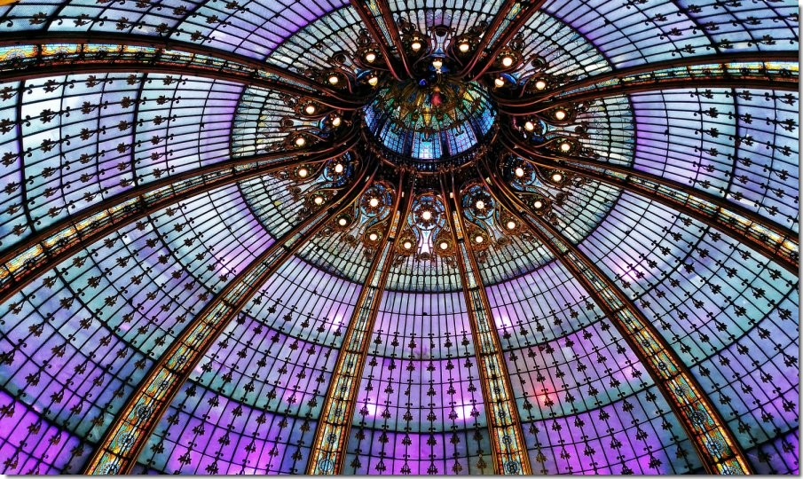 Le dôme de verre inspiré par le style byzantin, a 33 mètres de hauteur, est constituée de dix faisceaux de vitraux peints, enserrés dans une armature métallique richement sculptée de motifs floraux de style art nouveau . Les balustres des étages inférieurs, ornées de feuillages, sont signées Louis Majorelle, à qui l'on doit également la rampe d'escalier. Entre 1952 et 1956, les halls intérieurs sont supprimés et deux étages sont ajoutés. Au sommet du bâtiment, une terrasse permet de découvrir Paris.