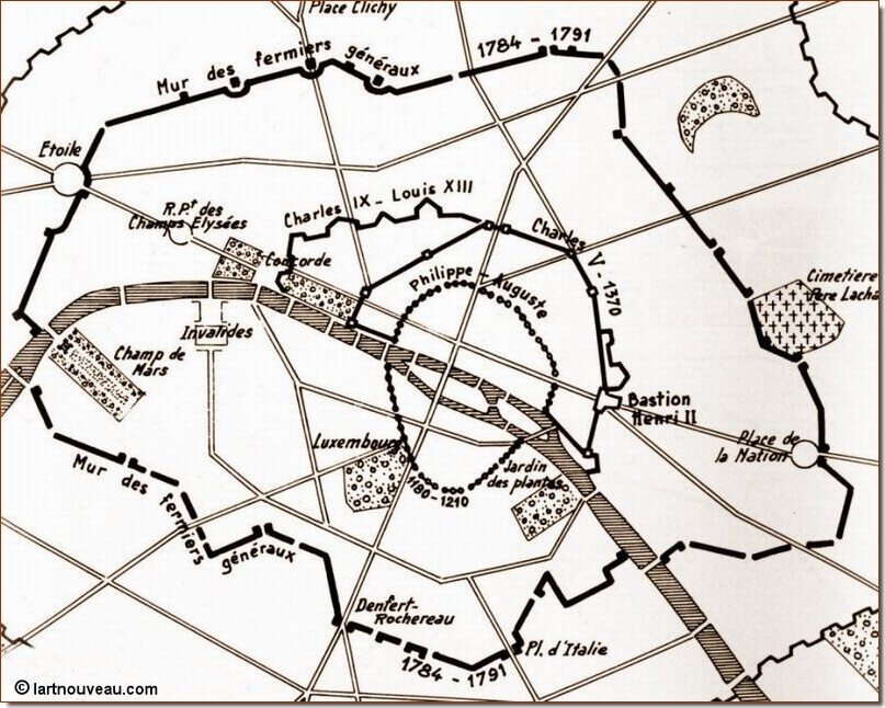 Le mur des Fermiers généraux qui a été érigé juste avant la Révolution de 1785 à 1788 était des enceintes successives de Paris. Elle n'était pas destiné à assurer la défense de la capitale mais à forcer le paiement à la Ferme générale des droits (octroi) sur les boissons et marchandises entrant dans Paris, par la voie d’eau ou de terre, et destinées à l’approvisionnement des habitants.