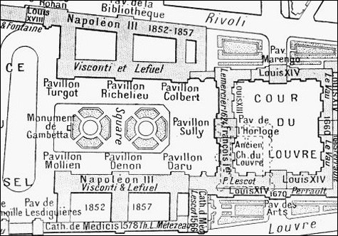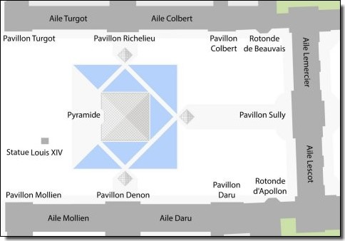 La cour Napoléon a été crée entre 1852 et 1852 suite à l'agrandissement du Palais du Louvre sur les plans de l’architecte Louis Visconti et terminée par son successeur Hector Lefuel à la demande de Napoléon III. Au centre ont été crées les squares du Louvre,