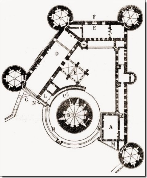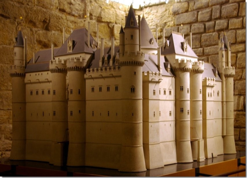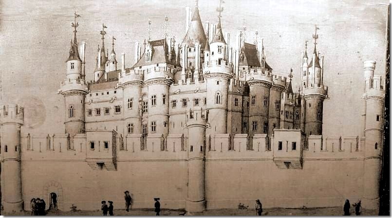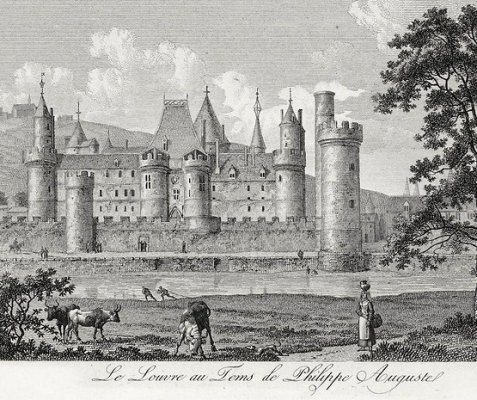 La construction du château du Louvre, à l'initiative du roi Philippe II dit « Auguste » a été réalisée de 1190 à 1202. Le château forme un rectangle de 78 mètres sur 72 mètres comprenait 10 tours, entourées de douves. Au centre un donjon circulaire ou "Grosse Tour" de 15 mètres de diamètre et haut de plus de 30 mètres. Sous Charles V, vers 1360-1365, des aménagements ont complété le château.
