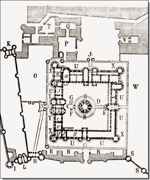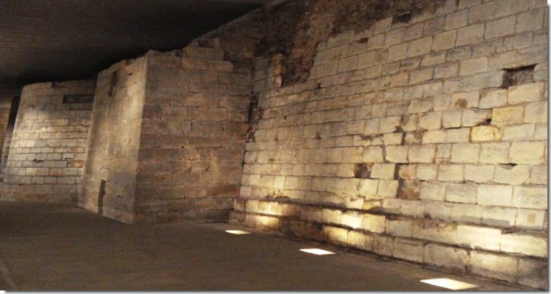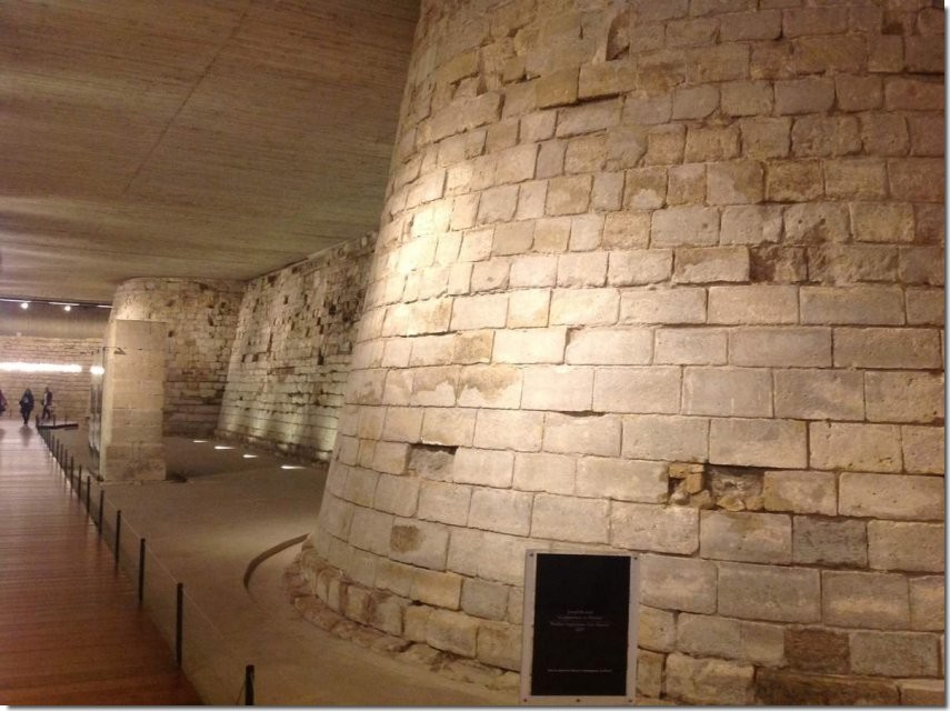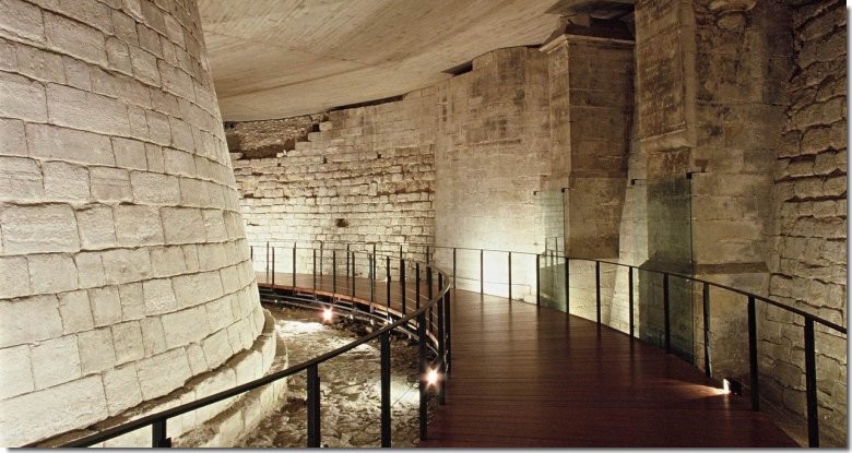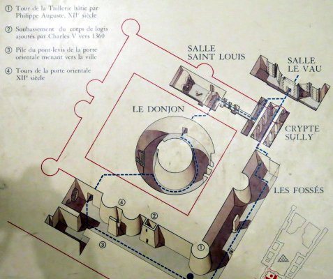 A la même époque est réalisée une enceinte dite l'enceinte de Philippe Auguste d'une longueur de 5 400 mètres qui parcourait les rives droite et gauche de Paris qui intègre le Louvre. François Ier décidant de le faire reconstruire dans le style Renaissance, le donjon est rasé au niveau du sol et les fossés sont ainsi comblés de terre. Les bases du château médiéval du Louvre ont été dégagées lors des fouilles archéologiques, en 1984-1985. Elles sont visibles au public depuis l'inauguration de la Pyramide1989, au sous-sol, au centre de la Cour Carrée accessible par le musée. Le château médiéval a été conservé sur une hauteur de sept mètres. Il se compose d'une enceinte carrée, cantonnée de tours aux angles, percée sur la face orientale d'une porte entourée de demi-tours. Un fossé, autrefois en eau, et la contrescarpe l'entourent sur les deux faces dégagées, les visiteurs circulant dans le fond du fossé. Au centre de l'enceinte, se dresse la base du donjon circulaire, "grosse tour" .