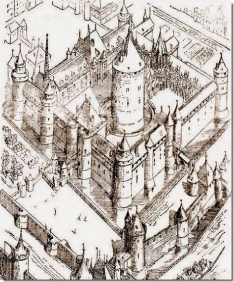 La construction du château du Louvre, à l'initiative du roi Philippe II dit « Auguste » a été réalisée de 1190 à 1202. Le château forme un rectangle de 78 mètres sur 72 mètres comprenait 10 tours, entourées de douves. Au centre un donjon circulaire ou " Grosse Tour " de 15 mètres de diamètre et haut de plus de 30 mètres. Sous Charles V, vers 1360-1365, des aménagements ont complété le château.