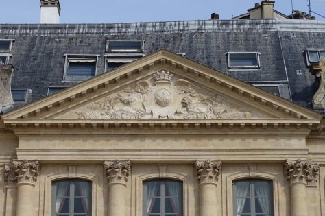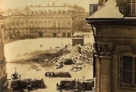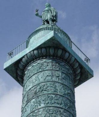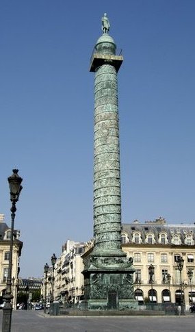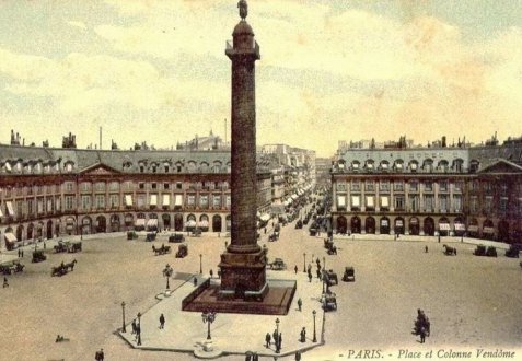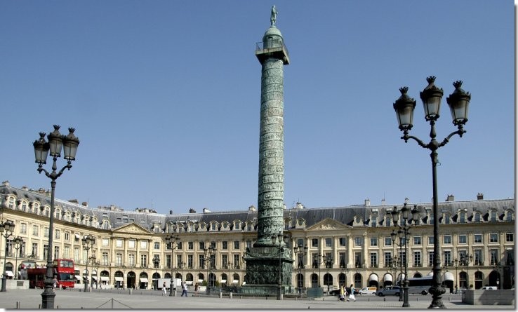 Les immeubles derrière ne furent construit que plus tard par divers architectes comme Jules Hardouin Mansart (1646-1708), Pierre Bullet (1639-1716) et surtout Jacques Gabriel (1667-1742). Le nom de la place a changé plusieurs fois dans l’histoire, provient de l'Hôtel de Vendôme qui se trouvait à son emplacement. Au centre de cette place, à l'endroit de l'ancienne statue du Roi Soleil Louis XIV de François Girardon, se dresse la Colonne Vendôme, inspirée de la Colonne Trajan de Rome. La colonne Vendôme a été érigée par Napoléon 1er afin de commémorer la bataille d'Austerlitz, en son sommet la statue de napoléon en César a été réalisée par Augustin Dumont (1801-1884) en 1863 Le peintre anarchiste Gustave Courbet, participa à sa chute provocatrice durant la Commune de Paris. Il fut lourdement condamné à la reconstruire et à la restaurer à ses propres frais. L'on accède à la place Vendôme par la rue de Castiglione venant de la rue de Rivoli et du jardin des Tuileries au sud et par la rue de la Paix venant de la place de l'opéra au nord