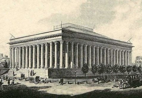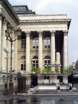 L’emplacement choisit fut le couvent des Filles de Saint- Thomas qui fut détruit, il avait été confisqué à la Révolution. Brongniart selon les désirs de l'empereur a conçu les plans d'un monument inspiré des basiliques antiques. Suite à son décès, Brongniart est remplacé par l'architecte Eloi Labarre qui achève les travaux en 1826. Une verrière qui éclaire la grande salle. Sur les côtés de chaque façade sont disposées, en 1851, des statues allégoriques : l'Agriculture et l'Industrie. En 1865 le tribunal de commerce est transféré dans l'île de la Cité en face du Palais de justice. En 1903 des agrandissements latéraux sont réalisés par Jean-Baptiste-Frédéric Cavel, il réalise un plan en croix grecque. La Bourse a perdu de son aura depuis l'instauration de la négociation informatique en 1986. Celle-ci entraîna l'abandon de la corbeille, qui perpétuait jusque là l'usage de la criée. L’arrivée de l'informatique n'exigeait plus aux opérateurs de se déplacer à la Bourse Le Palais Brongniart est devenu un centre de conférences et d’événements de référence Aux quatre angles d'élèvent des statues allégoriques: sur la façade principale à gauche la Justice par François Duret (1804-1865) ; à droite le Commerce par Augustin Dumont (1801-1884). Sur la façade arrière à gauche l'Industrie par James Pradier (1790- 1852); à droite l'Agriculture par Charles Seurre (1798-1858) . Le premier théâtre des Nouveautés de l'architecte François Debret a été construit en 1827 au 27 bis rue Vivienne en face de la Bourse. L'Opéra Comique s'y est installée de 1832 à 1840, puis le Théâtre de Vaudeville de 1840 à 1868.Le théâtre a été démoli en 1869 afin de permettre le prolongement de la rue Réaumur (maintenant rue du Quatre septembre). Un nouvel théâtre de Vaudeville e été construit sur le boulevard des Capucines.