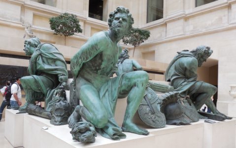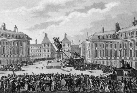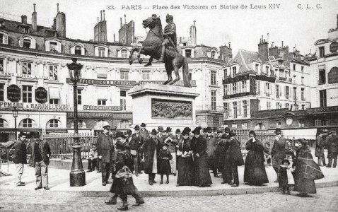 En 1685, c'est aussi l'initiative du duc que s'ouvre la place des Victoires, alors que ce dernier recherchait un cadre pour la réplique en bonze de la statue. La statue royale sera déboulonnée et détruite après la révolution le 10 août 1792. La statue pédestre du roi était encadrée au pied du socle de quatre grands captifs du culpteur français d'origine néerlandaise Martin van den Bogaert dit Martin Desjardins (1637-1694) ceux-ci ont été enlevés en 1790 et transportés dans la cour du Louvre. Après avoir été déplacés au fils des siècles, ils se trouvent actuellement dans la cour Puget du Louvre. Louis XVIII passera commande d'une nouvelle statue équestre de Louis XIV au sculpteur François-Joseph Bosio (1768 -1845) et à l'architecte Alavoine, représentera le roi en tenue d'empereur romain, chevauchant un cheval cabré. Le socle de marbre blanc recevra deux reliefs représentant le passage du Rhin et l'institution de l'ordre royal et militaire de Saint-Louis. Celle-ci a été inaugurée le 15 août 1822. Au 19e siècle la construction de nouvelles rues comme la rues des Fossés-Montmartre, la Croix-des-Petits-Champs etc.. modifia la forme de cercle de la place. Aujourd'hui, la lace des Victoires est devenue le lieu d'élection des boutiques de haute couture.