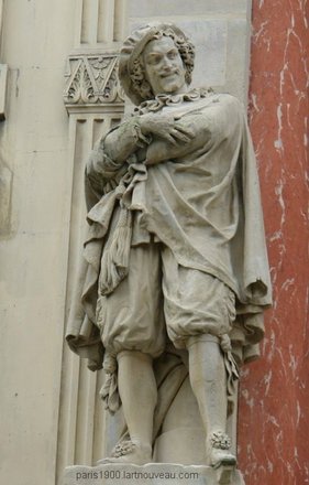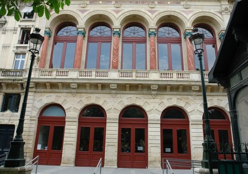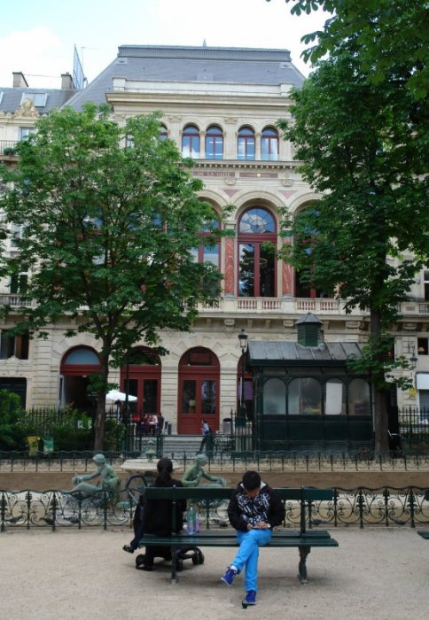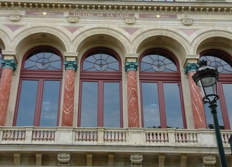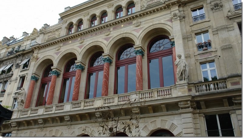 Les arcs retombent sur des colonnes et des pilastres de marbre rouge à chapiteaux de bronze. Le programme iconographique des sculptures de la façade est lié au monde du théâtre. Sur la corniche sont placées des sculptures: la Comédie sous les traits de Scapin de Amédée Doublemard (1826-1900) et le Drame sous les traits d'Hamlet de Eugène Louis Godin (1823-1887) Dans les combles, des pilastres cannelés séparent trois groupes de fenêtres géminées cintrées. Le théâtre connaît ses heures de gloire durant le second Empire Offenbach en assure en effet la direction pendant six ans: opérettes et musiques sont fréquemment jouées. En 1918, les Ballets Russes de Serge Diaghilev s'y produisent. Après des années de fermeture, le lieu est aménagé en 1989 en centre récréatif pour enfants la "Planète magique". Le Théâtre a été transforme par la Ville de Paris en centre dédié aux musiques actuelles et à l’art numérique.