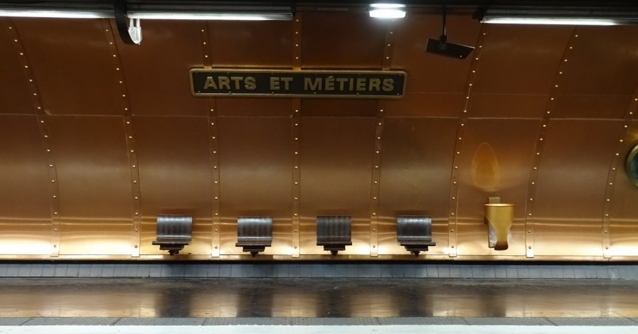 La station Arts et Métiers sur la ligne 11(Châtelet-Marie des Lilas) a été réaménagée en octobre 1994 à l’occasion du bicentenaire du conservatoire national des Arts-et-Métiers. Contrairement aux autres stations recouvertes de carreaux de faïence, elle a été entièrement recouverte de plaques de cuivre rivées les unes aux autres, qui donne l’impression d’être dans un sous-marin. Cette réalisation est due à Benoît Peeters, scénariste français, et François Schuiten, dessinateur belge, auteurs de la série Les Cités obscures.