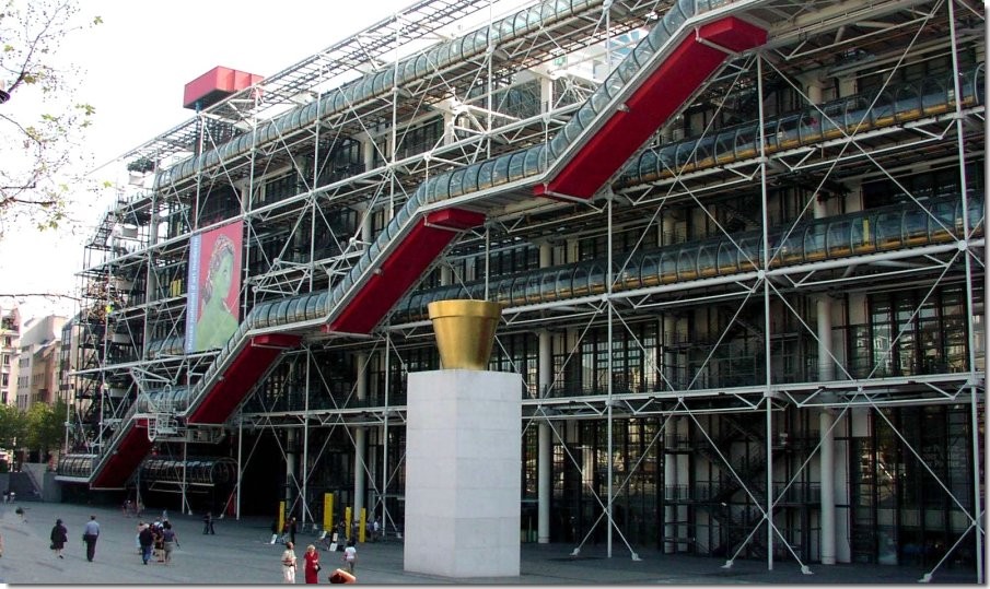 Il avait chargé les architectes Renzo Piano et Richard Rogers de construire un bâtiment réunissant un musée d'art moderne, une bibliothèque nationale et l'Institut de rechercher et de création artistique (Ircam). Les tuyaux multicolores de Beaubourg, placés au cœur de la capitale, déclencheront une furieuse polémique. Chaque niveau de l'édifice comporte un plateau de 7500 mètres carrés. Les escaliers, ascenseurs, escalators et l'ensemble des conduits d'aération et d'alimentation ont été repoussés à l'extérieur, en façade. La couleur des poutrelles et des gaines correspond à leur fonction : bleu pour l'air conditionné, vert pour les fluides, rouge pour les transports et jaune pour l'électricité. Face à la piazza, un grand escalier mécanique circule en diagonale, dans un tube de verre entouré par des arceaux. La Fontaine Stravinsky qui se trouve sur le côté du Centre a été réalisée en 1983 est le fruit d'une collaboration entre Jean Tinguely et Niki de Saint Phalle