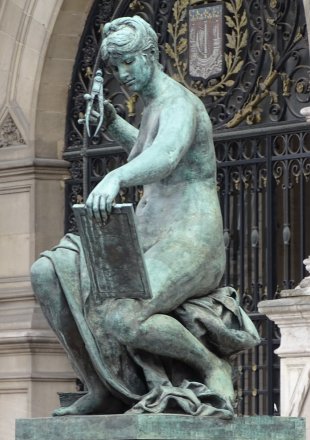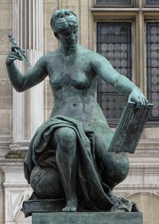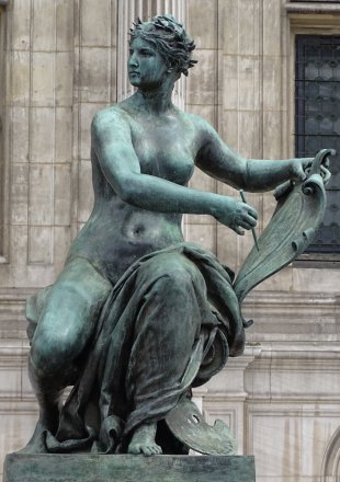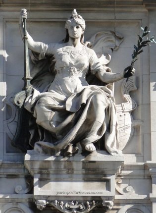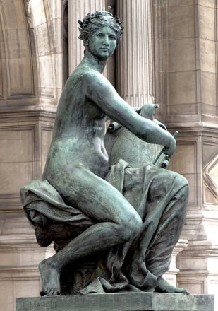 Devant la façade principale deux statues de femmes assises, en bronze représentant: à gauche, la Science, de Jules Blanchard et à droite, l’Art de Laurent Marqueste (1848-1920). Les façades de l’Hôtel de Ville de Paris sont agrémentées, dans des niches, de cent trente-six statues de grands (ou moins grands) personnages de l'histoire de Paris