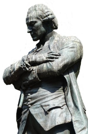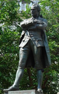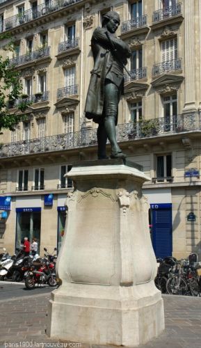 La statue de Beaumarchais par Louis Clausade (1862-1899) en 1895 est située au croisement de la Rue des Tournelles et de la rue Saint-Antoine dans le quartier du Marais.