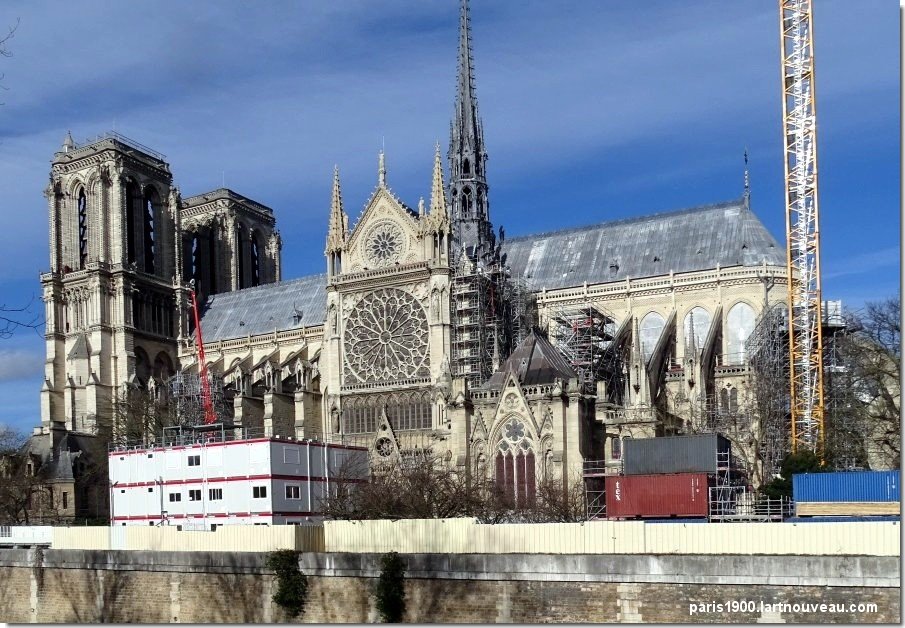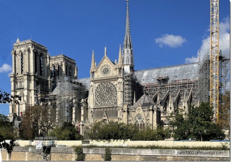 L'église a 130 mètres de longueur et 48 de largeur, avec un grand vaisseau et cinq nefs. La façade est tournée vers l'ouest avec un triple portail surmonté d'une grande rosace, les deux grandes Tours s'élèvent à 69 mètres. La partie la plus ancienne est le chœur (1163-1182).Entamée par le temps, endommagée à la Révolution Française, l'église a été restaurée à partir de 1841 par l'architecte Viollet le Duc qui décide d'ajouter une flèche à Notre Dame Des fragments originaux peuvent être observés au musée du Moyen Âge à l'Hôtel de Cluny à Paris. C'est lui qui a reconstruit la flèche, elle remplace celle d'origine qui s'est effondrée au XVIIIéme siècle, cette flèche s'élève à 96 mètres de hauteur. La superficie est de 5.500 m² peut recevoir 9.000 personnes, sa rosace du bras sud du transept mesure 12 mètres de diamètre. Le 15 avril 2019, vers 18 h 50, un incendie se déclare dans la charpente de la cathédrale. Rapidement, le feu se propage à l'ensemble du toit entrainant la chute de la flèche. Derrière la cathédrale, à l'extrémité est de l'île de la Cité se trouve le square Jean XXIII . Devant la cathédrale se Trouve le parvis Notre Dame, la place jean Paul II avec à son extrémité la Préfecture de police ancienne caserne Lobau.