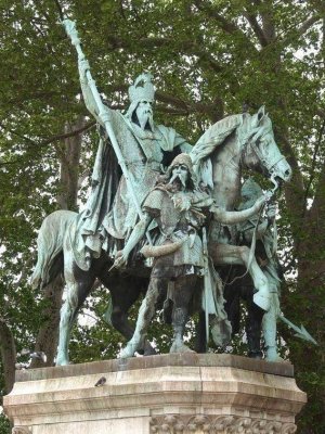 La statue de Charlemagne à cheval conduite par Olivier et Roland en bronze a été exécutée en 1877 par louis et Charles Rochet elle a été présentée pour la première fois à l'Exposition Universelle de 1878 de Paris. A gauche de la rue centrale Neuve Notre-Dame est matérialisée l'emplacement du rempart du IVe siècle et de l'ancien Hôtel Dieu (dont les contours de la chapelle rasée en 1802 apparaissent en bas à gauche), l'église Sainte-Geneviève des Ardents est évoquée par le tracé de son abside au fond à droite. Le départ de la rue de Venise et le site de l'hospice des Enfants Trouvés sont indiqués. Plus près de la cathédrale, sont aussi inscrits dans la pierre le point zéro des routes de France (plaque de bronze aux armes de Paris) et remplacement de la première basilique Saint-Étienne, dont la façade avançait 40 m plus à l'ouest que la cathédrale Notre-Dame. Le Parvis a pris le nom de place Jean Paul II en 2006 par une décision de la municipalité