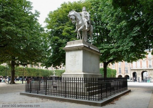 Le square Louis XIII d’une superficie de 12 706 m² est situé au centre de la place des Vosges. La statue équestre en marbre de Louis XIII a été réalisée par le sculpteur Jean-Pierre Cortot (1787-1843) sur un modèle de Charles Dupaty (1771-1925), installée en 1825, la première statue datant de 1639 avait été détruite pendant la Révolution. Les quatre fontaines alimentées par l'Ourcq, ont aussi été réalisées par l'architecte Jean-François Mesnager et le sculpteur Jean-Pierre Cortot (1797-1843).
