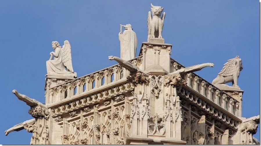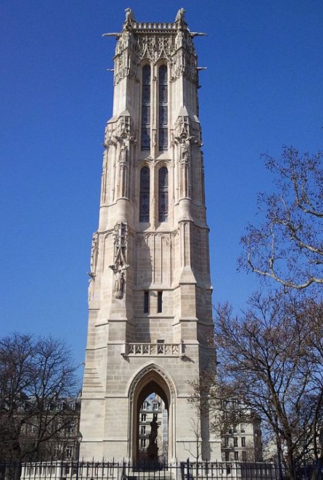 La Tour Saint-Jacques haute de 58 m était placée à l'origine sur le côté de l'église Saint Jacques de la Boucherie. Placé là dès l'époque carolingienne, le sanctuaire était à un carrefour important de voies menant au pèlerinage de Saint-Jacques de Compostelle. Le clocher de style gothique flamboyant a été érigé entre 1509 et 1523 , la statue du clocheton est celle de Saint Jacques.