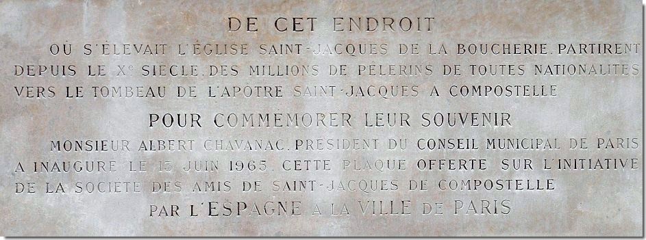 La tour Saint-Jacques se trouve en bordure de la rue de Rivoli entre la place du Châtelet et de l'Hôtel de Ville L'église a été détruite à la Révolution et la tour vendue en 1792. En 1836, la Ville de Paris l'acquiert et la fait restaurer par Théodore Ballu en 1853. Au premier étage, côté du boulevard de Sébastopol se dresse un Saint Jean-Baptiste, de Charles Cordier Au sommet, les quatre symboles évangéliques: l'Ange, le Lion, le Bœuf, l'Aigle et la statue de Saint-Jacques Le Majeur en costume de pèlerin (haute de 4 m), sont dus à Jean-Louis Chenillon. Sous la tour, au rez-de-chaussée: statue en marbre de Biaise Pascal, par Pierre Cavellier 1857 Les façades furent restaurées et toute la sculpture refaite, y compris la statue de saint Jacques par Chenillion, haute de 4,50 m et perchée au sommet, et les symboles des Évangélistes placés aux angles.