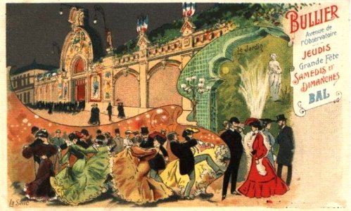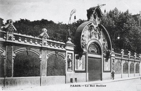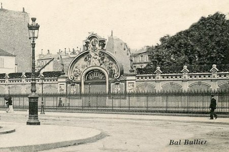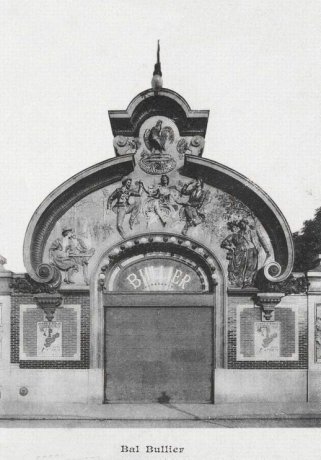 Historique Un ancien employé du Bal de "La Grande Chaumière" situe sur le Boulevard du Montparnasse, François Bullier (1796-1869) rachète en 1843 le "Prado d'Ete" situé au 31, avenue de l'Observatoire Paris 5e, en 1847, le transforme complètement, plante 1000 pieds de lilas et lui redonne le nom de "Closerie des Lilas ". L’établissement ouvre ses portes le 9 mai 1847. Il devint ensuite le "Jardin Bullier" puis le" Bal Bullier" et finalement "Le Bullier". Cet établissement est fréquenté à l'origine par les étudiants. Ce Bal sera ouvert toute l'année, Bullier continue à l'agrandir et lui donnera en 1850 un air oriental en l'ornant de lampes a gaz dans les bouquets et d'un décor de vitraux.On dansait quadrille et la valse, puis la mazurka et les scottishs e enfin la polka. Ce bal dont les décors se sont inspires de l'Alhambra propose plusieurs animations comme billards, tir a l'arc ou au pistolet. A l'intérieur du fronton fait de céramique vitrée est installée; en 1895 la représentation du coq gaulois sur les emblèmes des facultés; dessous est inscrite la phrase "salvatit et placuit ". Un groupe de femmes et deux étudiants qui portent le "sophisme"( sorte de chapeau ) dansent le cancan. Le fronton monumental de l'entrée principale, un bas-relief en terre cuite sculptée et émaillée, est mis en place en 1895. Il représente un coq gaulois debout sur les emblèmes des Facultés. Réquisitionné pendant la guerre de 1914-1918 par l'Intendance, il sera utilise pour la fabrication des uniformes. Il rouvrira ses portes en 1920 et entrera en concurrence avec Luna Park pour disparaître finalement avant la dernière guerre. Sources: Site sur la famille Bullier