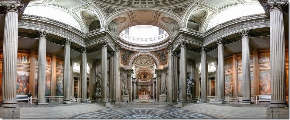Louis XV décide rebâtir l'église de l'abbaye Sainte-Geneviève en 1744 au sommet de la Montagne Sainte-Geneviève. Jacques Germain Soufflot est désigné comme architecte pour réalisé le Panthéon, Le roi pose de la première pierre en 1764. Le Panthéon est construit en forme de croix grecque de 110 m de long, 80 m de largeur et 83 m de haut. Le fronton a été réalisé par le sculpteur Pierre Jean David d'Angers (1788 - 1856)