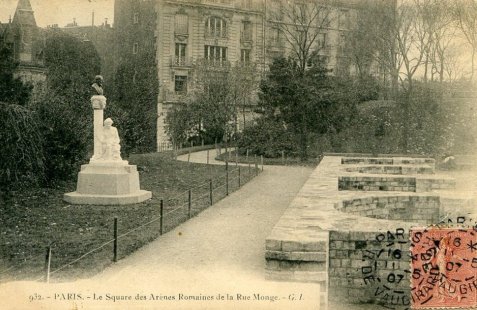 Les arènes de Lutèce, d'une superficie de 12 168 m², situées dans la rue Monge sont " le plus vieux monument de Paris " dans son site d'origine. le square des arènes de Lutèce se prolonge vers l'ouest par le square Capitan . Construites à la fin du Ier siècle après J.-C., les arènes restèrent en activité jusqu'à la première destruction de Lutèce, à la fin du IIIe siècle.