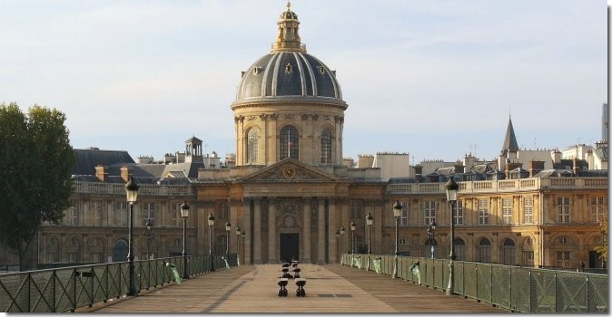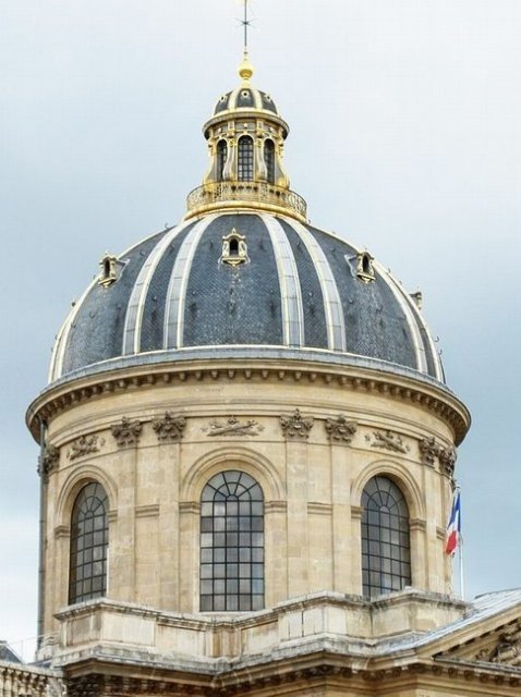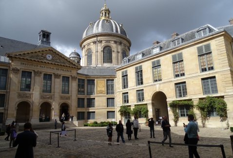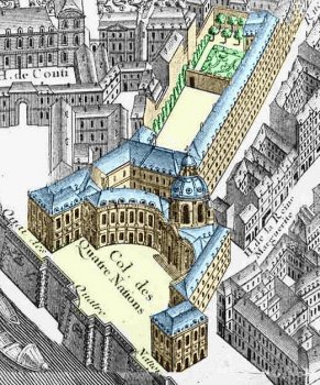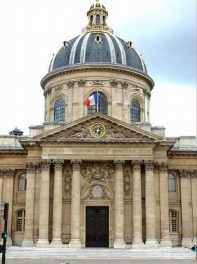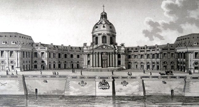 L'institut de France, situé quai Conti en bordure de la Seine face à la passerelle des Arts a été en 1795. Il a été installé dans l'ancien bâtiment du collège des Quatre-Nations en 1805 à l'initiative de Napoléon 1er. L'aménagement initial par Louis Le Vau (1612-1670), premier Architecte du roi Louis XIV, signé en 1659, prévoyait un édifice en demi-lune avec deux corps de bâtiments encadrant une chapelle. Le bâtiment réalisé est composé d'une chapelle, à coupole, encadrée par deux ailes en quart de cercle terminées par deux pavillons ornés.