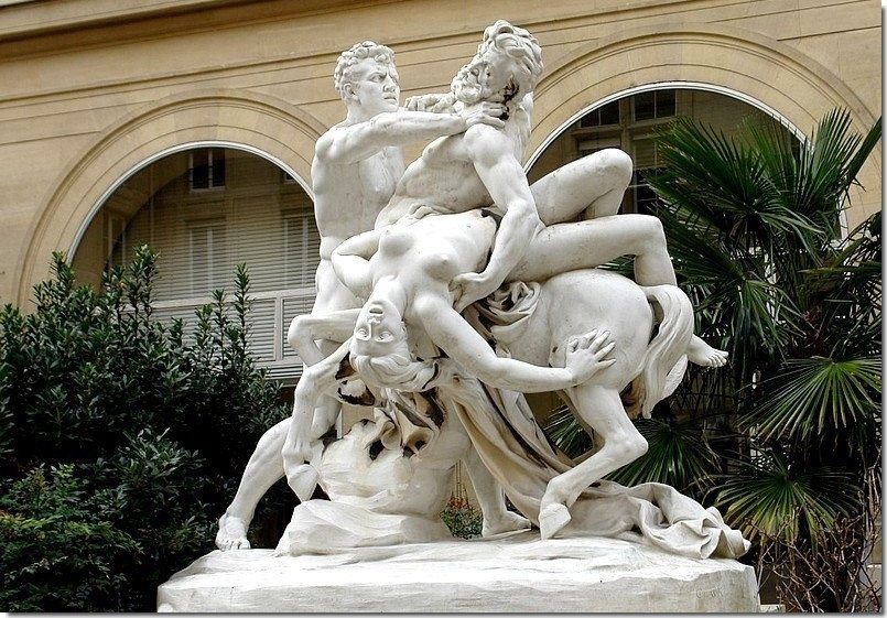 La mairie est composé de trois travées rythmées par trois baies en plein cintre, flanquées de pilastres cannelés d'ordre dorique avec entablement. L'étage supérieur ouvre sur la place par des fenêtres à meneaux encadrées par des colonnes corinthiennes engagées, il couronnée d'une frise à beffroi avec une horloge. En 1886, le bâtiment est agrandi vers les rues de Mézières et Madame, sur les plans de Ginain. La cage de l'escalier d'honneur, en pierre, est ornée d'une allégorie du Travail, peinte par H. Martin en 1914. Dans la cour un groupe en marbre: Le Combat du Centaure (1888-1900) de Gustave Crauck (1827 -1905) - Combat avec un Lapithe qui a été exposé à l'Exposition Universelle de 1900