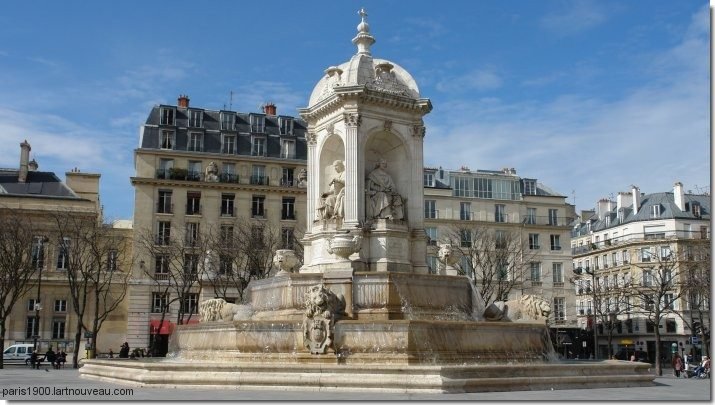 La fontaine Saint-Sulpice (ou fontaine des quatre évêques) a été construite en 1844 d'après les plans dessinés par l'architecte Louis Visconti (1791-1853), auteur également de la fontaine Molière dans le 1e arr. Elle sera nommée fontaine "des quatre point cardinaux" du fait de la présence des quatre statues d'évêques: Bossuet, évêque de Meaux, Fénelon archevêque de Cambrai, Massillon évêque de Nîmes et Fléchier évêque de Clermont.