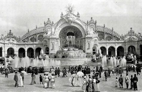 Le château d'eau L'eau jaillit d'une immense grotte, à laquelle est agrafée une série de vasques superposées, où se brise une nappe d'eau de 3o mètres de hauteur et de 10 mètres de largeur au milieu de laquelle émerge une allégorie un peu compliquée, représentant « l'Humanité conduite par le Progrès, s'avançant vers l'Avenir »; deux personnages étendus à terre et foulés aux pieds par le génie du motif représentent la routine. Le château utilise 100 000 litres d’eau par minute. A droite et à gauche s'allongent deux galeries, que terminent des rotondes, surmontées de coupoles.
