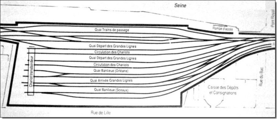 La gare d'Orsay a été construite en bordure de la Seine, quai Anatole France sur l'emplacement du Palais d'Orsay edifié de 1810 à 1840 et détruit sous la Commune de Paris en 1871. Sa construction commencée en 1898 sous la direction de l'architecte Victor Laloux (1850-1937) Grand Prix de Rome et professeur à l'école des Beaux-Arts de Paris. La ligne Austerlitz - Orsay a été ouverte pour l'Exposition Universelle 1900, elle a été construite en bordure de la Seine sous ses quais hauts. Une seule gare intermédiaire la gare Saint-Michel, située près de la place Saint Michel