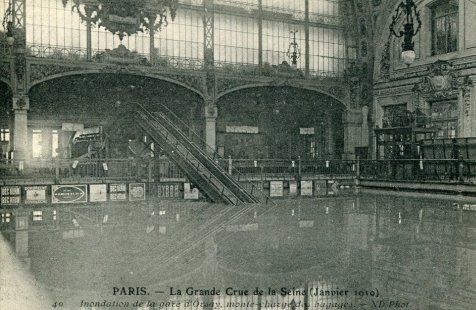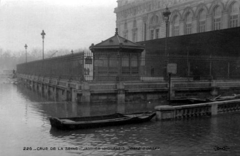 La gare d'Orsay a été inondée durant la crue de janvier 1910. La gare a été fermée le 21 janvier 1910 en raison de la montée des eaux de la Seine. Le 24 janvier, la gare d’Orsay n’est plus qu’un vaste lac. La hauteur dépasse 8 mètres ; au fond de ce gouffre, deux trains entiers sont engloutis.