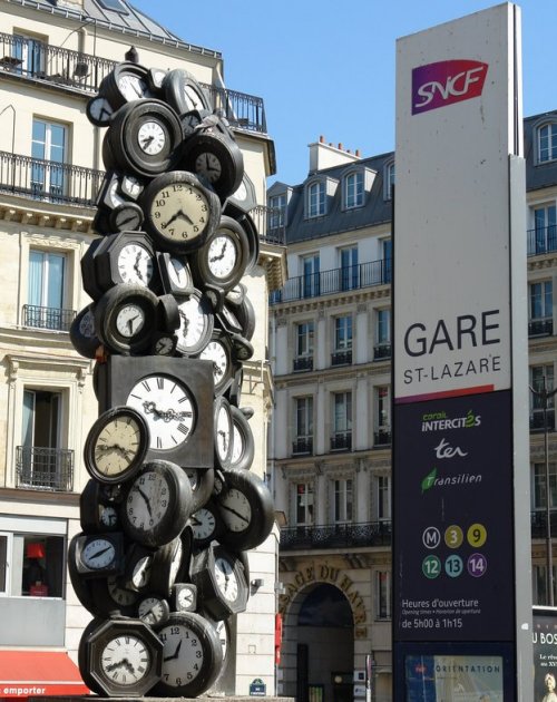 La façade actuelle a été réalisée de 1885 à 1889 par l'architecte Juste Lisch (1828-1910) afin d'accueillir les voyageurs attirés par l'exposition Universelle de 1889. L'ancien bâtiment sur la rue Saint-Lazare est démoli. L'hôtel Terminus est érigé entre deux places la cour du Havre et la cour de Rome. Deux œuvres d'art accumulations d'Arman hautes de six mètres ont été placées dans les cours de la gare St Lazare: Consigne à vie dans la cour de Rome et l'Heure de tous dans la cour du Havre.
