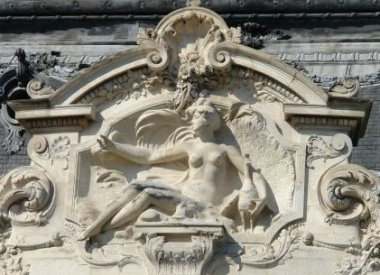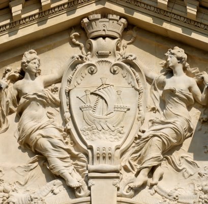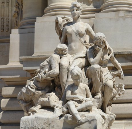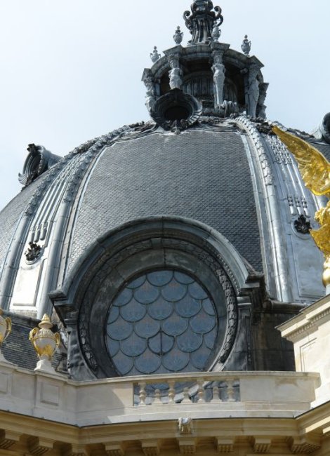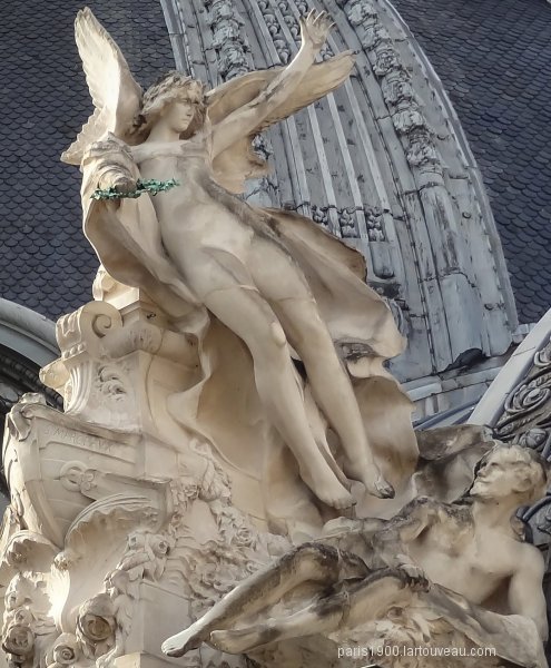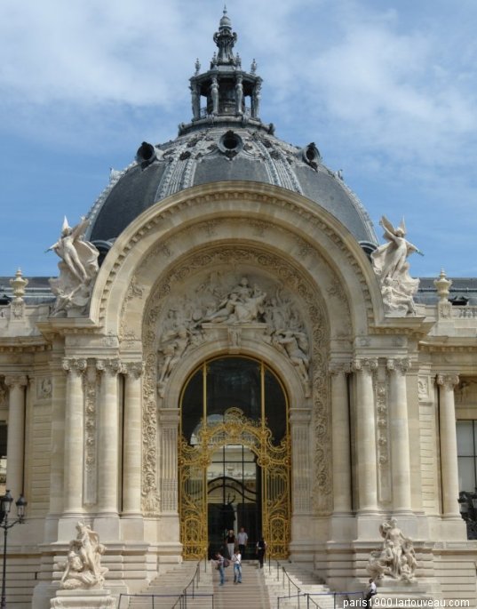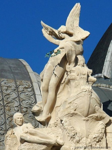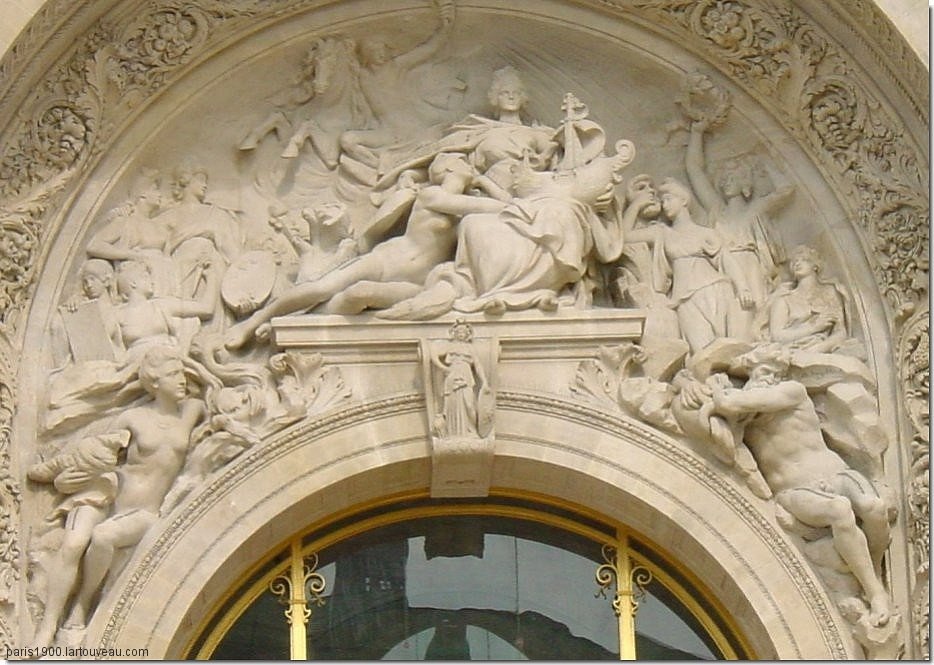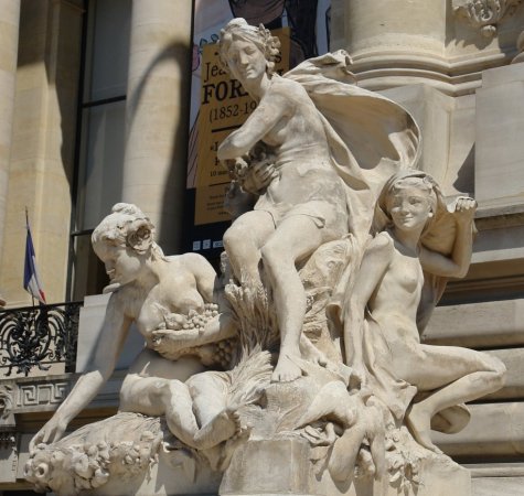Le fronton est orné d’un bas-relief la Ville de Paris protégeant les arts d’Antonin Injalbert. Au sommet de la façade deux génies : à gauche le Génie de la Peinture, à droite le Génie de la sculpture de René de Saint-Marceau. Le grand escalier est flanqué de deux groupes : à gauche les quatre Saisons de Louis Convers, à droite la Seine et ses rives de Désiré Ferrary.