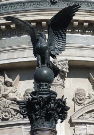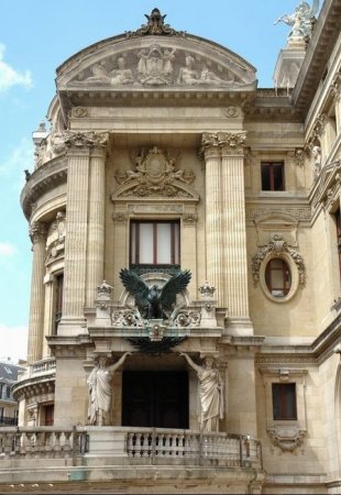 L’Opéra est flanqué sur ces côtés de deux pavillons semi-circulaires. Celui donnant sur la rue Auber, était conçu pour accueillir l’empereur Napoléon III. Une double rampe permettait ainsi aux souverains de descendre de voiture loin de la foule, mais il n’a été achevé qu’après la chute du second empire. Les façades latérales sont entourées d'une balustrade surmontée de huit colonnes monumentales ornées d'éperons de navires et de vingt-deux statues lampadaires.