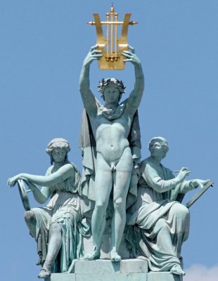 La façade est couronnée par deux groupes monumentaux en bronze doré, à gauche, l'Harmonie; à droite la Poésie, de Charles Gumery (1827-1875) Sur le grand pignon de la scène, se dressent trois groupes en bronze doré. Au sommet: Apollon, élevant sa lyre, avec la poésie et la musique, de Aimé Millet (1818-1991) De chaque côté, des Pégases, de Eugène Lequesne (1848-1939).
