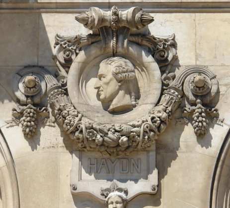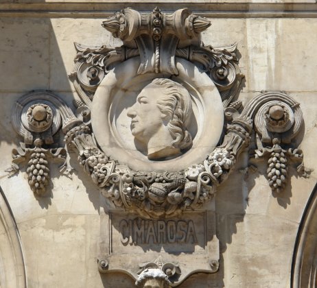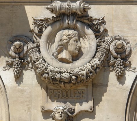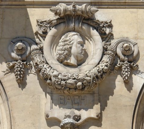 Au-dessus de ces statues figurent quatre médaillons en bas-reliefs contenant des profils de musiciens, par Charles Gumery (1827-1871)
