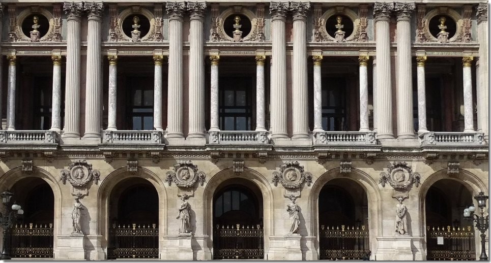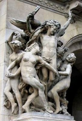 La grande façade est flanquée de deux avant-corps ornés au rez-de-chaussée de quatre groupes monumentaux en pierre : l'Harmonie de François Jouffroy (1806-1822), la Musique instrumentale de Eugène Guillaume (1822-1905), la Danse de Jean-Baptiste Carpeaux (1827-1875) et le Drame lyrique de Jean Perraud (1819-1876).