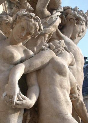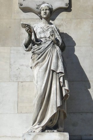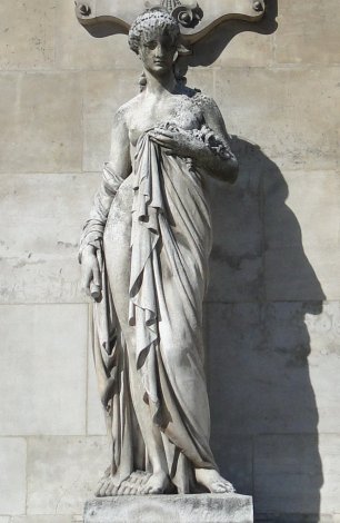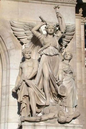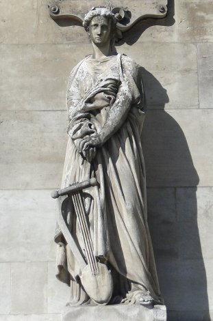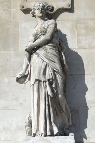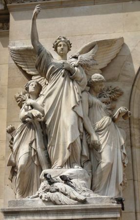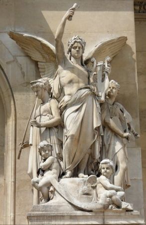 Au rez-de-chaussée, entre les arcades de la partie centrale, quatre statues allégoriques en pierre: de gauche à droite, l'Idylle, par Eugène Aizelin (1821-1902), la Cantate, par Henri Chapu (1833-1891), le Chant, par Paul Dubois (1829-1905), le Drame, par Alexandre Falguière (1831-1900).