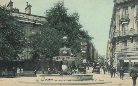La place doit son nom à une enseigne de taverne sur laquelle on pouvait voir le saint terrassant le dragon. La fontaine d'origine servait à faire boire les chevaux, tarie en 1906 par la construction du métro, elle a été remise en eau en 1995. De chaque côté de la place se dressent deux hôtels particuliers : l'Hôtel Dosne Thiers et L'Hôtel de la marquise de Païva et au sud le théâtre Saint-Georges ce dernier a été inauguré le 8 février 1829, transformé par Charles Siclis, le film Le Dernier Métro de Truffaut.