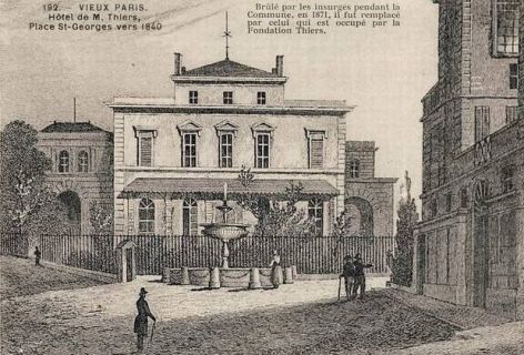 Alexis Dosne receveur des finances et promoteur du lotissement du quartier Saint-Georges, fait édifier en 1832 un premier hôtel de facture néo-classique, sobre édifice orné de colonnes à chapiteaux ioniques que sa femme vendit à Adolphe Thiers (1797-1877) quand celui-ci épousa sa fille, Élisa Dosne. Aménagé par l'architecte Charpentier, l'hôtel abrite ses collections d'objets d'art. En 1871, la Commune fait détruire l'hôtel de son principal adversaire, alors réfugié à Versailles, l'immeuble est reconstruit en 1873 par Aldrophe en style néo-Louis XIV, il abrite de somptueux salons au décor soigné La belle-soeur de Thiers, Félicie Dosne, surnommée " la demoiselle d'Etat ", lègue la demeure et ses collections à l'Institut de France en 1905 C'est aujourd'hui la Fondation Dosne-Thiers qui détient une bibliothèque renommée ouverte aux chercheurs. Le jardin de l'hôtel le square Alex Biscarre, a été transformé en espace en libre accès