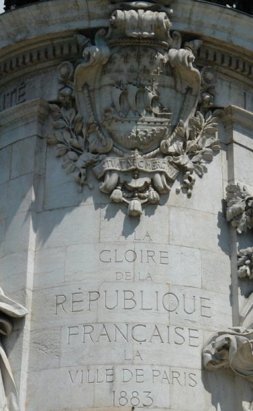 Autour du piédestal, trois grandes figures assises en pierre symbolisent la Liberté, qui porte une torche, l'Egalité, qui brandit le drapeau de 1789 et la Fraternité, assise sur une charrue. Devant le socle circulaire marche un grand lion en bronze, haut de plus de 3 mètres. Tout autour douze bas-reliefs en bronze qui représentent les évènements majeurs à l'origine de la naissance de la République, entre 1789 et 1880: Le Serment du jeu de Paume (2o juin 1789), la Prise de la Bastille (14 juillet 1789), l'Abandon des privilèges (4 août 1789), la Fête de la Fédération (14 juillet 1790), la Patrie en danger (juillet 1792), la Bataille de Valmy (2o septembre 1792), l'Abolition de la royauté (21 septembre 1792), le Vaisseau le Vengeur (1e juin 1794), le Peuple de Paris acclamant le drapeau tricolore (29 septembre 183o), l'Institution du suffrage universel (4 mars 1848), le Gouvernement de la défense nationale (4 septembre 1870), la fête nationale place de la République (14 juillet 1880). Ce monument remplace deux fontaines successives, la première fontaine aux Lions transportée en 1869 au marché aux bestiaux qui a fait place au parc de la Villette , la seconde, remontée en 1884 sur l'actuelle place Félix Eboué. En 1878, afin de glorifier la nouvelle République, un concours d’architecture est organisé afin d’élaborer un grand monument destiné à être placé au centre de la place de la République nouvellement crée. La première place est remportée par les sculpteurs les frères Morice Léopold Morice (1846-1919) et Charles Morice 1848-1918). Le projet de Jules Dalou arrivé en seconde position c'est concrétisé place de la Nation