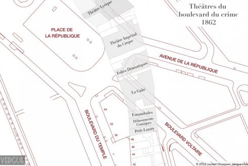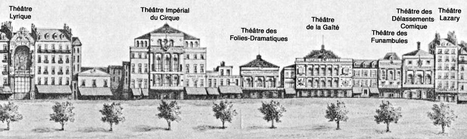 De nombreux théâtres y ont été construits, il pris, à partir de 1830, le surnom de "boulevard du Crime" en raisons des spectacles sanguinolents donnés dans ses théâtres. Mais, en 1862, la création de la place du château d’eau, la place de la république actuelle par le baron Haussmann amputa la partie nord du boulevard du Temple et entraînèrent la destruction de nombreux théâtres dont certains ont été transférés dans un autre quartier de Paris. Le théâtre Déjazet au n°41 est le seul rescapé.