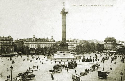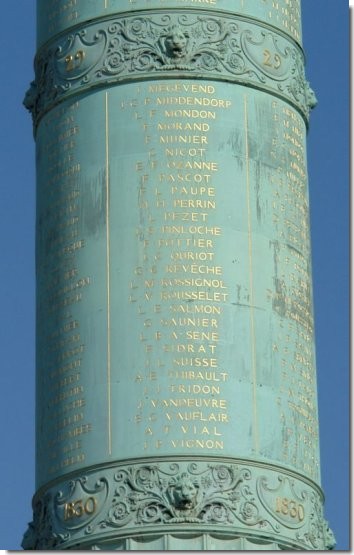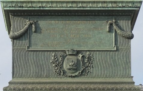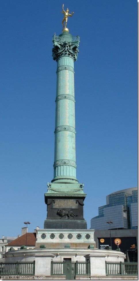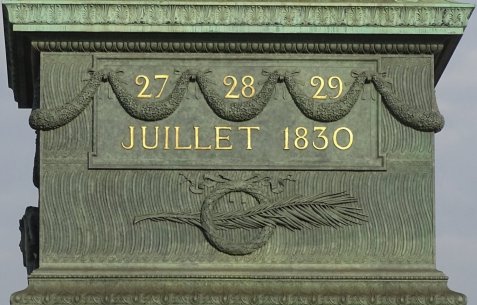 Le roi Louis-Philippe décide en 1833 de construire la Colonne de Juillet, déjà prévue en 1792, mais pour, cette fois, commémorer les "Trois Glorieuses" les trois journées" de 1830. construite et décoré en 1839 par l'architecte Joseph-Louis Duc, elle est inaugurée en 1840. L'insurrection parisienne des 27, 28 et 29 juillet 1830, née des brimades politiques subies par l’opposition sous les ministères ultras de Charles X et qui a abouti à la monarchie de Juillet.