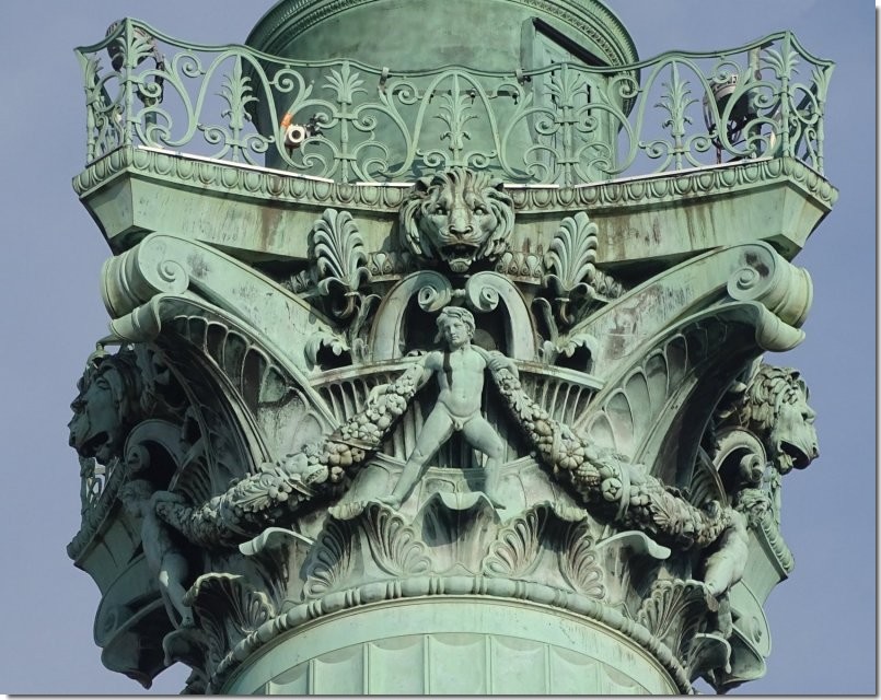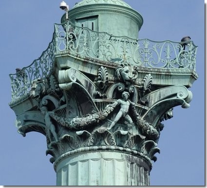La colonne de Juillet porte en son sommet une statue représentant le Génie de la Liberté du sculpteur Augustin Dumont (1801-1884). Elle repose sur un socle et une forme de bassin circulaire réalisés sous le premier empire afin d'accueillir une fontaine avec une sculpture d'éléphant en son centre, mais la sculpture ne fut jamais réalisée, faute de crédit en raison des guerres. Dans les fondations furent aménagés des caveaux funéraires destinés à abriter les ossements des 504 victimes de juillet 1830. Véritable ossuaire, le sous-sol de la colonne reçut aussi près de 200 corps de la Révolution de 1848