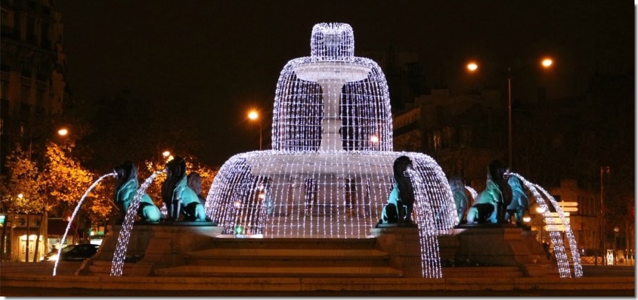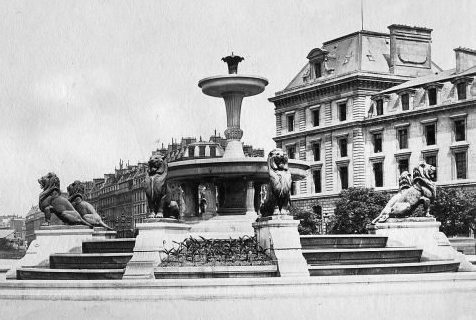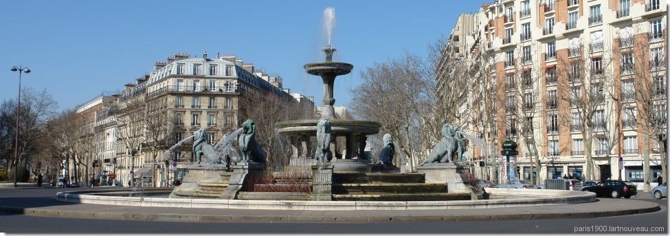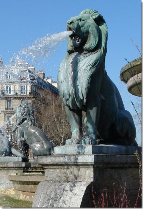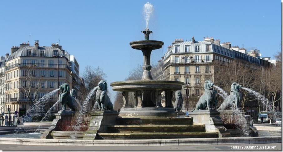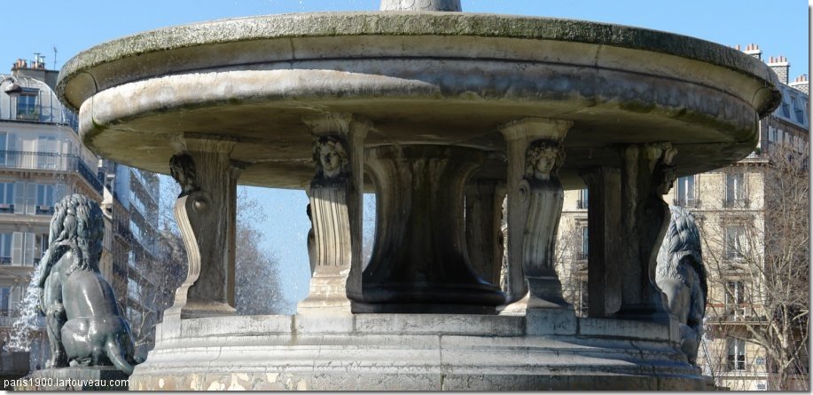 Cette fontaine a dut être démontée en 1879 pour permettre l'installation du monument à la gloire de la République . Le grand bassin circulaire est surmonté de trois bassins superposés en gradins, et est orné de huit lions en bronze assis sculptés par Henri-Alfred Jacquemart .La vasque inférieure est soutenue par huit consoles en pierre, décorées de têtes féminines sculptées par Louis Villemot