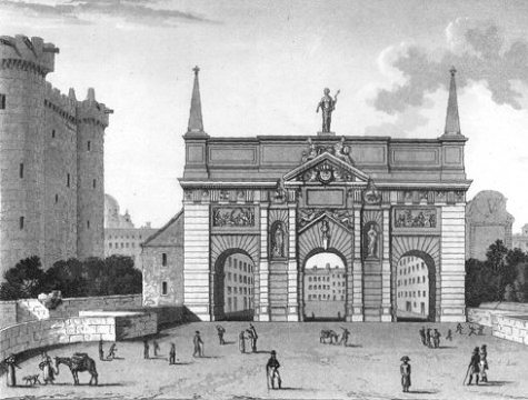 La porte Saint-Antoine qui l'une des portes de Paris à l'est de la Capitale a été plusieurs fois reconstruite. La porte sur l'enceinte de de Philippe Auguste a été reconstruite près de la place de la Bastille lors de la création de l'enceinte de Charles V au XIVe siècle. Le roi Henri III fait élevé un arc de triomphe en 1585. Louis XIV demanda à l'architecte François Blondel (1618-1686) d'ajouter deux autres arcades. Deux Fleuves décorent les impostes de l'arc réalisés par le sculpteur Jean Goujon. Cette porte a été démolie en 1778.