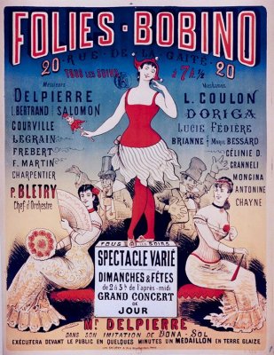 Ce music-hall doit son nom à un clown-magicien italien du 19ème siècle : Bobino, qui créa rue du Maine la Baraque à Bobino en 1812. La salle est construite en 1873, 20, rue de la Gaîté sous le nom Les Folies Bobino. Tout d'abord guinguette, la salle devient café concert vers les années 1880. Après la seconde guerre mondiale, la salle, qui compte alors près de 1100 places, devient un tremplin de la chanson : de Brassens à Gréco, Durant les années 80 Renaud, Reggiani, Coluche, Bedos ou Le Luron etc.. s’y produisent. Mais en 1983, en raison de problèmes financiers la salles est fermée puis détruite destruction en 1985.Reconstruit en 1987 en boîte de nuit, Bobino redevient salle de spectacle en 1991 sous le nom de Studio Bobino.