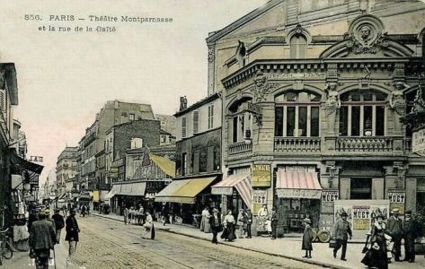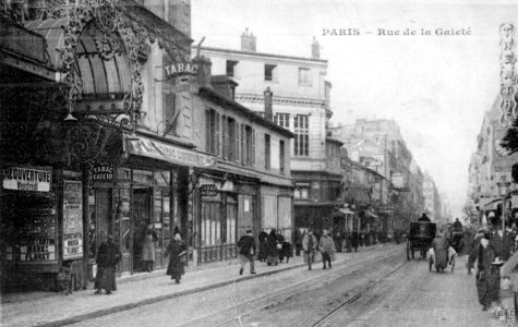 Dans les années 1900 la rue de la Gaîté n'était peuplée que de bistrots et salles de spectacles : le bal des quatre-saisons au n° 15, le bal des Mille Colonnes au n° 20, les Folies Bobino au n° 20, le théâtre de Montparnasse, ou encore la Gaîté Montparnasse. Une grande partie ont aujourd'hui disparus, quelques-uns subsistent encore, le plus célèbre le Théâtre de Bobino reconstruit à la fin du 20e siècle.