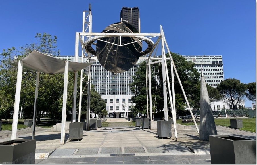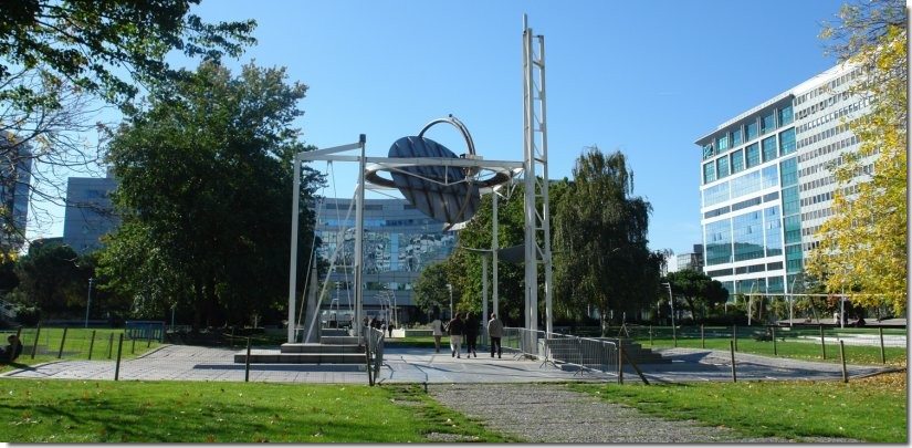 Traversée en son centre par une allée qui mène à la fontaine de l'île des Hespérides où l'on trouve un portique dont chaque pied héberge un équipement météorologique ( devenu hors service) et qui supporte un grand miroir orientable. La végétation persistante, ornant le parc, est empruntée à la nature des façades atlantiques des deux continents et offre outre le vert, du mauve, du blanc et du bleu.