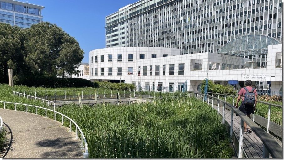 Le Jardin Atlantique a été conçu, en 1994 par François Brun et Michel Péna paysagistes, au-dessus des voies de la gare Montparnasse sur une surface de 3,50 hectares, il est entouré par des barres d'immeubles de bureaux et d’habitations. Une grande pelouse carrée libre d'accès constitue le centre du parc.